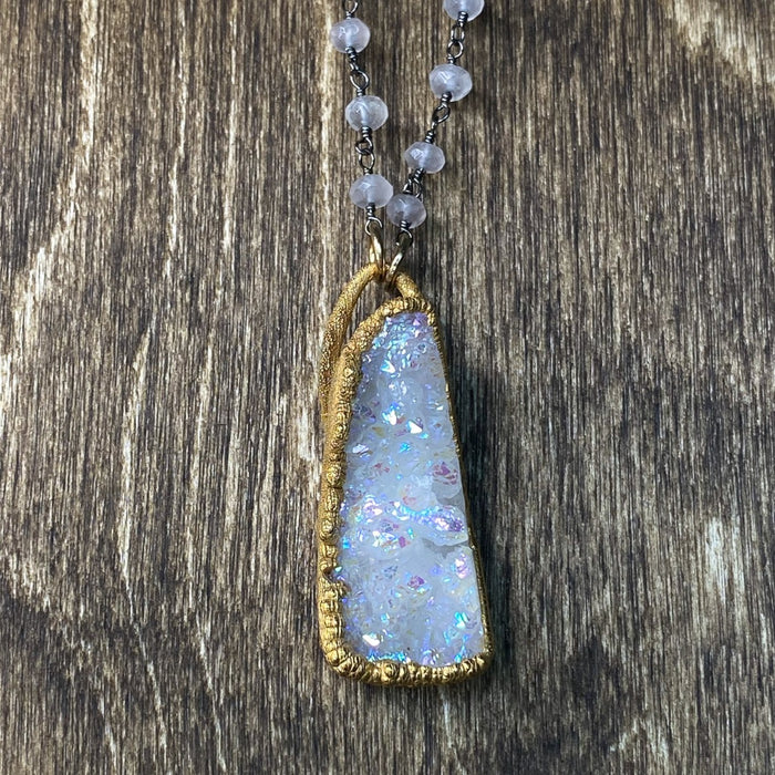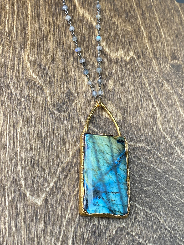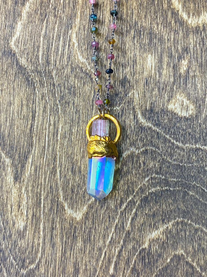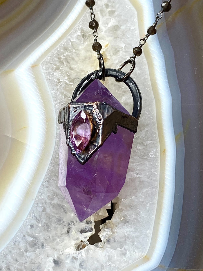 Each piece in this collection has been handcrafted by me through a process called electroplating. First in copper, then in 24k gold. The metals work with the stones as an amplifier of the stones natural energetic properties. The stones for each piece were creatively channeled and carefully curated into stellar combinations.